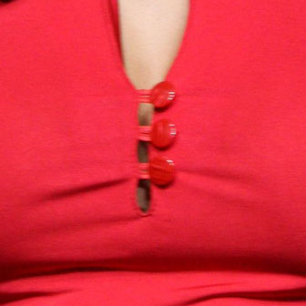 Глубокий узкий вырез горловины внизу застегивается на маленькие пуговки, что придает пикантность модели.