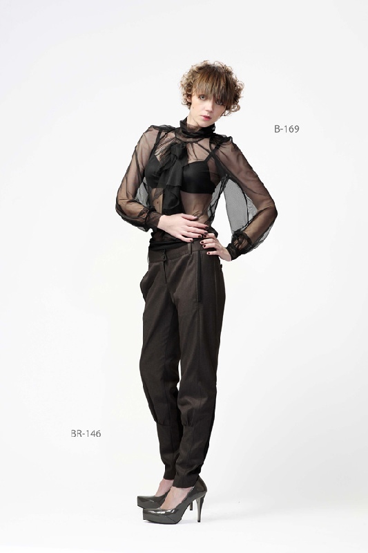 Блузка прекрасно сочетается с брюками из костюмной ткани с защипами под коленом.