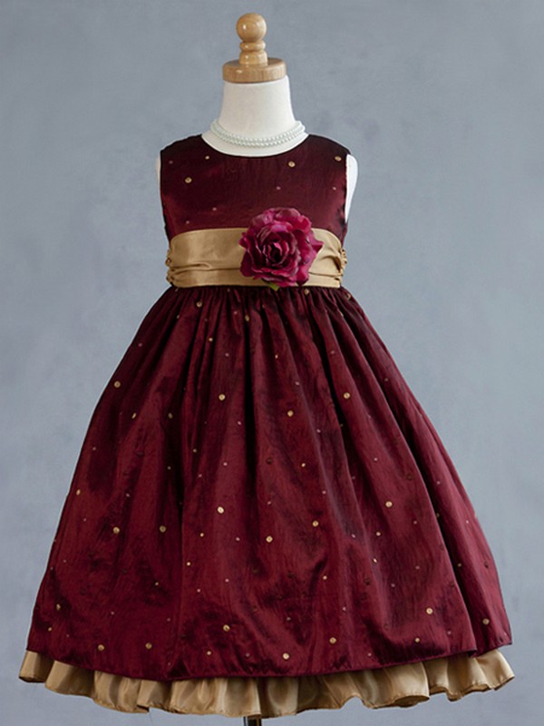 Нарядное детское платье не имеет рукава, оставляя обнаженными руки, которые будут красиво смотреться на темном фоне платья. Лиф на талии украшен поясом цвета золота и роскошной в тон основного цвета платья розой. Юбка заканчивается подъюбником золотого цвета.