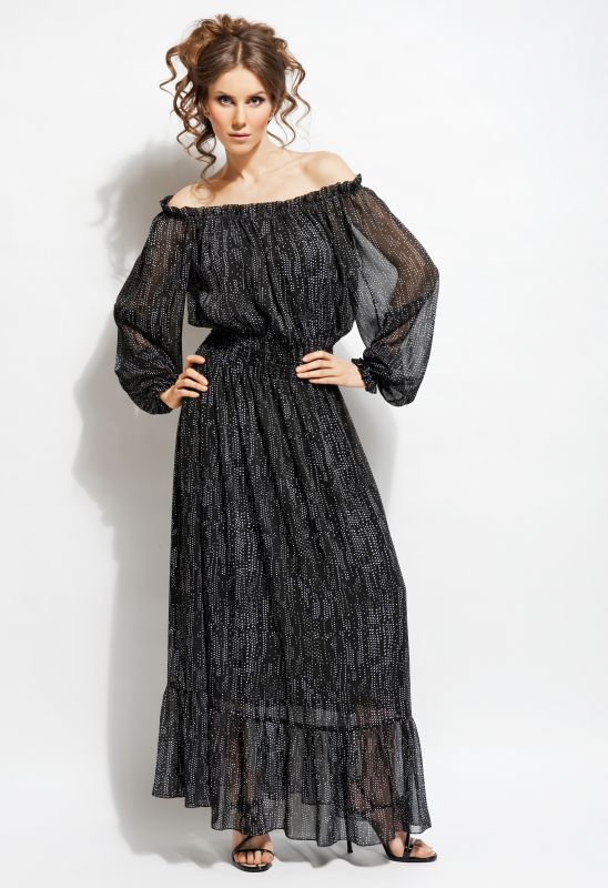 Чрезвычайно нарядное черное платье в мелкий белый горох, в котором горловина очень широкая, собранная на резинку. Это позволит Вам самостоятельно выбрать стиль декольте: оно может быть просто открытое, можно приспустить резинку и оголить одно плечо, а можно резинку спустить на руки и оба плеча окажутся открытыми.
