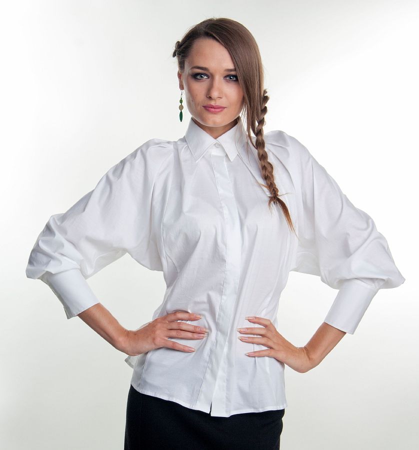 Длина блузки – до линии бёдер. Основная часть блузы – прямая, ни чем не украшенная, что делает этот наряд ещё более модным. Рукава – вот уникальная особенность этой модели. От линии плеча, рукава очень свободные, сзади имеется несколько складок, благодаря чему и создаётся эффект летучей мыши. Длина рукава – чуть больше, чем три четверти. У основания имеются плотные высокие манжеты.