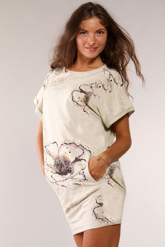 Короткое летнее платье, выполненное из трикотажного полотна с крупным рисунком. Вырез горловины круглый, по краю обработанный узкой однотонной полоской ткани. Рукава короткие, цельнокроеные с полочкой и спинкой. По краю рукав обработан той же тканью, что и вырез горловины и отвернут узким манжетом. По переднему полотнищу от низа изделия выполнены небольшие рельефы, которые заканчиваются обработанными в них карманами. Платье покроено в свободном силуэте, слегка сужающееся к низу. Длина модели – ниже середины бедра. Низ модели подогнут и закреплен.