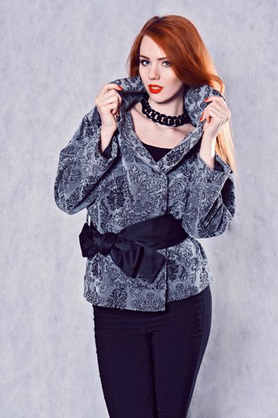 Эффектная элегантная и оригинальная куртка из ткани с ажурным рельефным орнаментом. Особый шарм модели придает нежный серо-синий цвет, а также широкий атласный пояс, который составляет яркий декор.