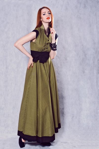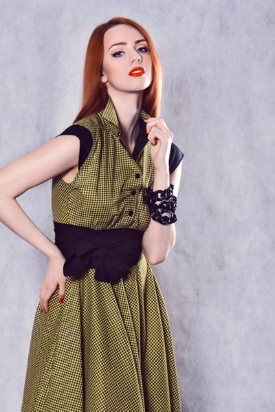 Приталенное элегантное платье с яркими идеями в крое и пикантным принтом в мельчайшую черную клетку, которая выполнена на основном горчичном фоне. Платье отличается оригинальным воротником в рубашечном стиле, деликантными черными рукавами-крылышками, контрастным кантом по низу роскошной расклешенной юбки, на линии талии красуется широкий пояс-кушак, что придает всему образу особенную элегантность.