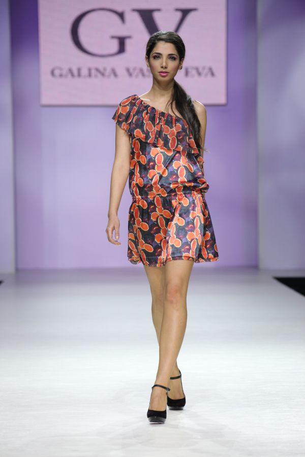 Платье выполнено из ткани с авторским принтом "половинки инжира", украшенного авторской монограммой. Благодаря содержанию эластана, модель очень комфортна и прекрасно ложится по фигуре. Женственность и сексуальность образу придает покрой на одно плечо, украшенный мягкой широкой оборкой.