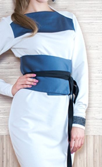 Эффектное белое платье приталенного силуэта с оригинальной отделкой ярко-синего цвета, а также изящным поясом-корсетом, который подчеркивает грацию фасона и придает особенный эффект и оригинальность модели. Утонченное и элегантное, но в то же время эффектное и темпераментное платье подчеркнет незаурядность стиля его обладательницы, и станет одним из эффектных приобретений для осенне-зимнего сезона.
