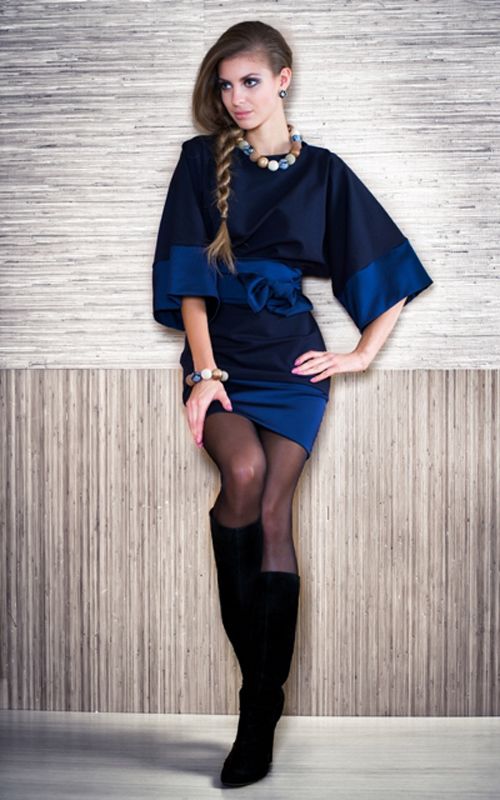 Эффектное короткое платье, шарм которому придает не только оригинальный фасон, но уже и глубокий темно-синий цвет, который колоритно подчеркнут яркими атласными элементами: манжетами на широких рукавах, притачным поясом, который декорирует низ платья, а также декоративным поясом на линии талии, который завязывается на изящный бант.