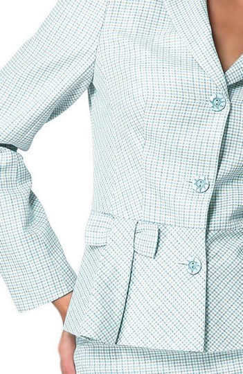 Классический приталенный жакет с «английским» воротником с отворотами и традиционной для данного стиля застежкой на пуговицы, особый шарм которому придает отрезная баска, декорированная изящным бантом. Модель исполнена в невероятно утонченном светло-серо-голубом цветовом ансамбле, глубину которого особенно подчеркивает тончайшая клетка. Деловой обед, официальный прием, визит на торжественное событие – жакет не только удачно подчеркнет респектабельность делового стиля, но и окажется всегда «кстати» даже для простой прогулки по магазинам.