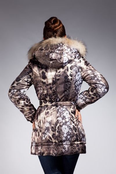 Куртка с оригинальным анималистическим принтом, особый эффект которой придает роскошный капюшон, отороченный натуральным мехом енота и декоративный кант по низу. Модель выполнена в приталенном силуэте, который также подчеркивает и эластичный пояс, застегивающийся на талии. Застежка – кнопки и молния, которая также использована и в прорезных боковых карманах. Капюшон и меховая оторочка – отстегиваются.