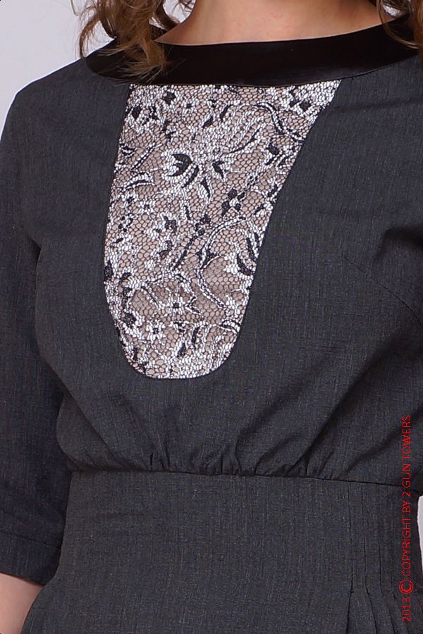 Эксклюзивная модель из новой коллекции творческого дуэта Две Сорванные Башни - Изящное платье, шарм которому придает кружевная вставка, а оригинальность - застроченные складки от линии талии, которые создают приталенный силуэт и подчеркивают бедра. Складки расходятся аккуратными волнами ниже на элегантной юбке, которая создана в изумительном фасоне "тюльпан". Модель имеет рукава в 3/4, застежка "молния" - на спинке, шлица - сзади по центральному шву.