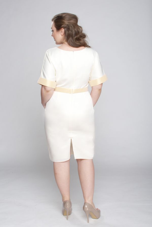 Очаровательное торжественное платье из изысканного атласа с отделкой из тафты. Кремовый цвет модели элегантно подчеркивает декоративная золотистая лента, которая делает акцент на линии талии, а также образует манжеты рукавов. Изящная модель для особого торжества.
