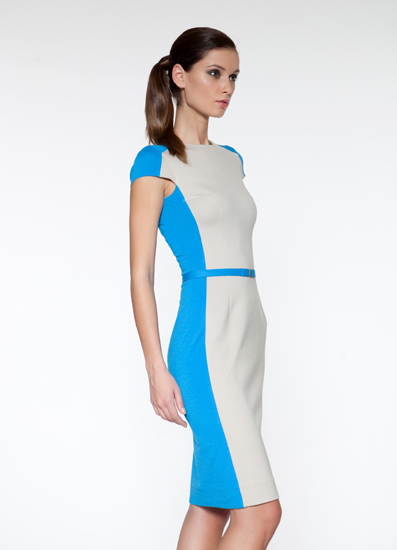 Строгое бело-голубое платье с короткими рукавами. Прямой вырез. Приталенный крой отлично подходит к любой фигуре. Состав: вискоза.
