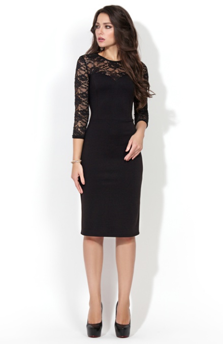 Коктйельное платье из джерси с гипюром. Платье прилагающего силуэта, отрезное по линии талии. В среднем шве спинки шлица. Вырез горловины круглый, неглубокий. Благодаря сочетанию полупрозрачного гипюра и плотного трикотажа, создается имитация платья-бюстье. Сердцеобразный вырез на груди – классический вариант выреза декольте для вечерних платьев. Такой элемент подходит почти для всех типов фигур, так как визуально увеличивает грудь и удлиняет шею. Рукав выполнен из кружева, длина ¾.