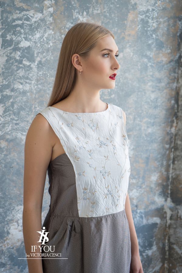Основная ткань - итальянский 100% шелк немного держит форму, что непременно красиво подчеркнет вашу фигуру. Верхняя декоративная вставка из 100% итальянского шелка с цветочным орнаментом.