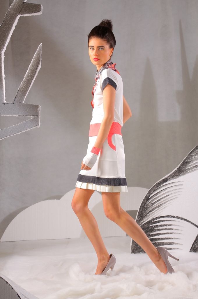 Фасон модели достаточно необычный и экстравагантный. Юбка имеет длину чуть выше линии колен. Прямой покрой позволяет ей отлично садиться по фигуре. Подол немного расклешен, украшен небольшими воланами, которые делают этот наряд более привлекательным и необычным. Внизу имеется декоративная вставка из чёрной ткани, которая придаёт юбке пикантности. Модель отлично смотрится под обувь на высоком каблуке, а так же хорошо сочетается с разнообразными блузами.