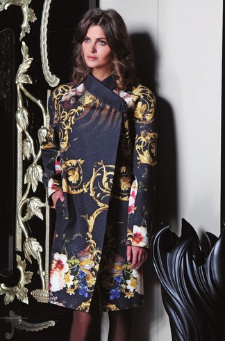 Эксклюзивная модель из новой коллекции итальянского брэнда Dino Chizari - плащ-пальто прямого кроя с модным эффектным воротником запашного кроя, что позволит варьировать с вариантами стиля верха модели. Воротник имеет застежку на пуговицу, ниже идет скрытая застежка до самого низа. Уникальный принт, сочетающий цветочный принт и фантазийный "золотистый" орнамент создает неординарный и притягательный образ.