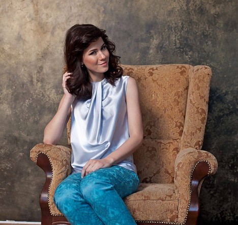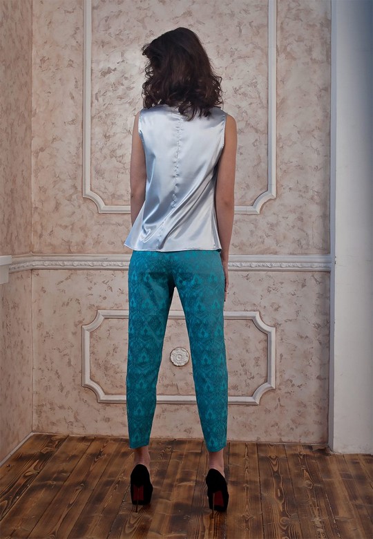 Блуза нежного голубого цвета со сложной драпировкой, без рукава, со вставками из эксклюзивного кружева на воротнике-стойке