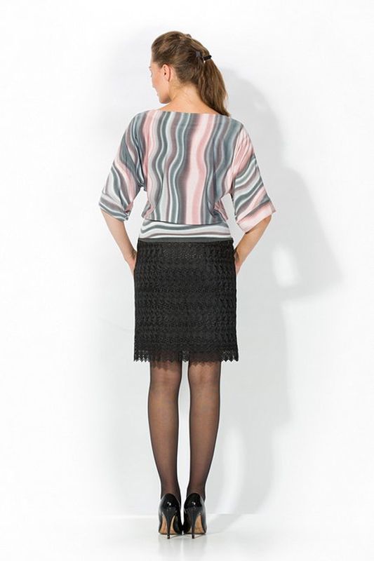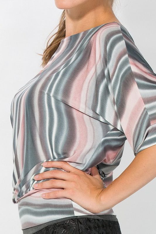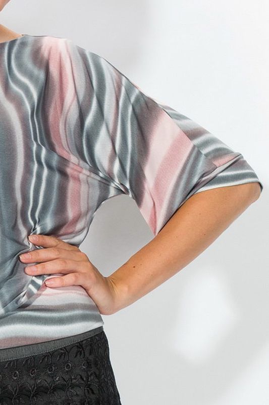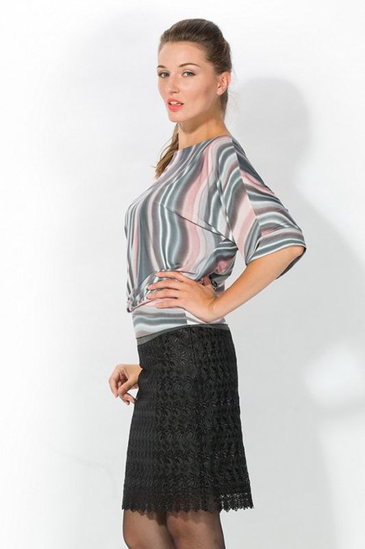 Стильная блуза с кроем рукавов в стиле «летучая мышь» и оригинальным принтом, несомненно, станет одной из ярких моделей в гардеробе модного осенне-зимнего сезона. Блузка не только изящна, но также весьма комфортна, благодаря эластичности и мягкости ткани, из которой она выполнена, а также удобна - крой модели предусматривает притачной пояс по низу блузки, что дает возможность варьировать с длиной всей модели в соответствии с особенностями в стиле брюк, или юбки, которую Вы подберете в ансамбль.