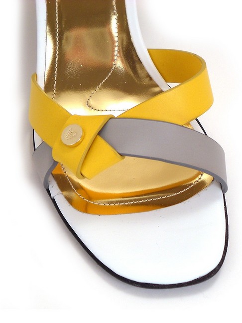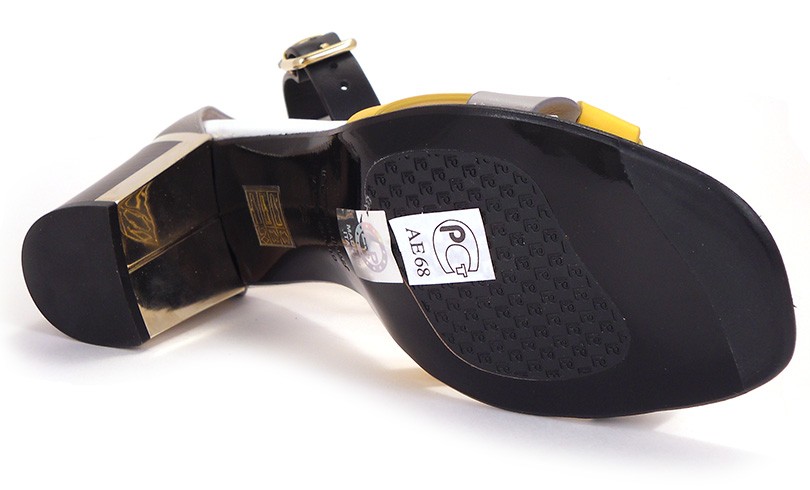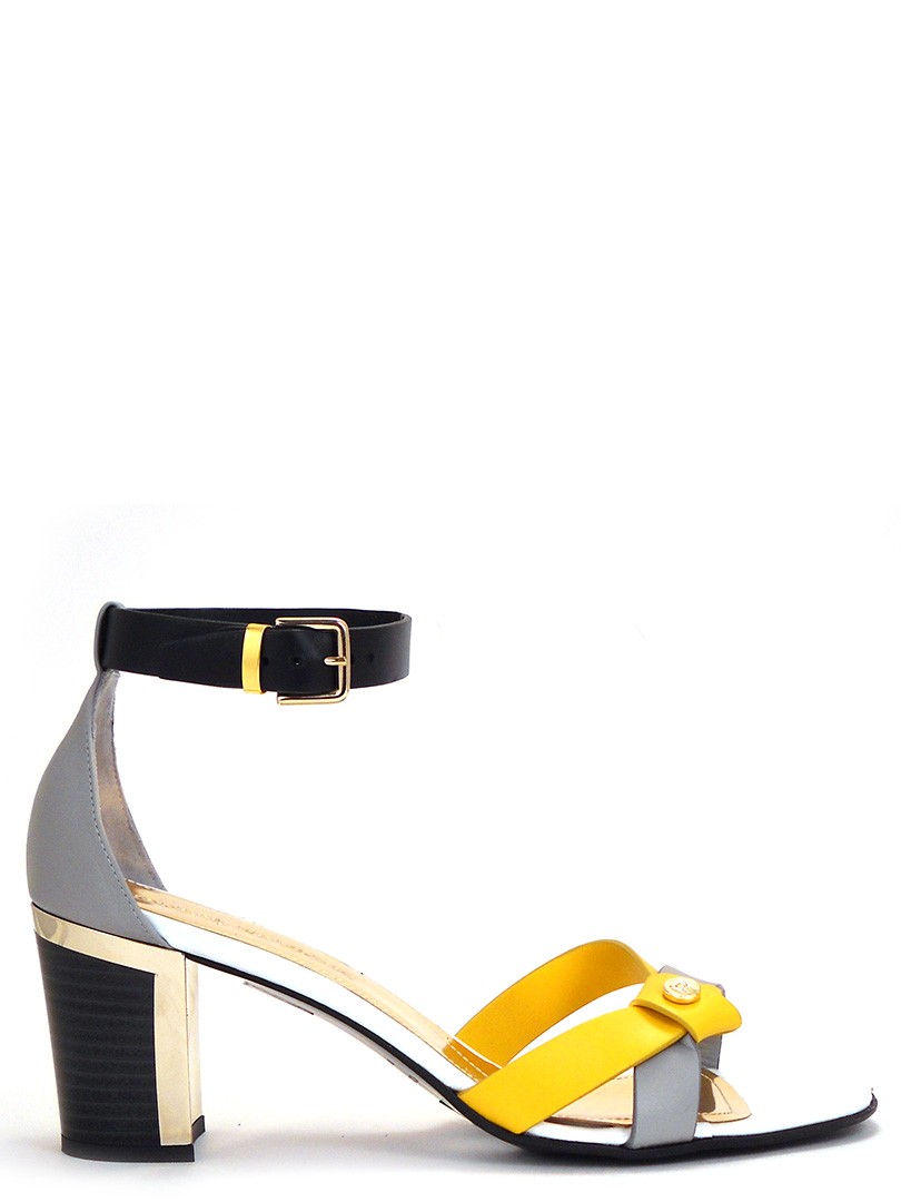 Босоножки классические на устойчивом 7см каблуке. Верх сандалий сделан из мягкой, но плотной кожи. 2 ремешка - охристый желтый стальной светло -серый - переплетаются в красивый узел и декорируются золотой плоской кнопкой с фирменным логотипом. Черный широкий ремешок на застежке красиво обвивает щиколотку. Коллекция от итальянского бренда LORETTA PETTINARI.