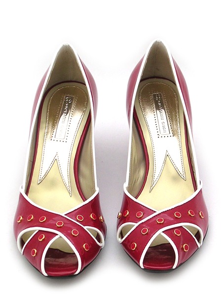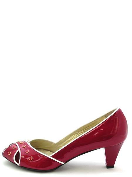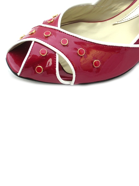 Туфли из натуральной, лаковой кожи насыщенного красного цвета. Спереди полоски кожи красиво переплетены между собой. Туфли оригинально декорированы. Подкладка изготовлена из телячьей кожи. Подошва из натуральной кожи, прорезиненная. Мысок открытый. Каблук невысокий. Колодка очень удобная, подходит под стандартную стопу.