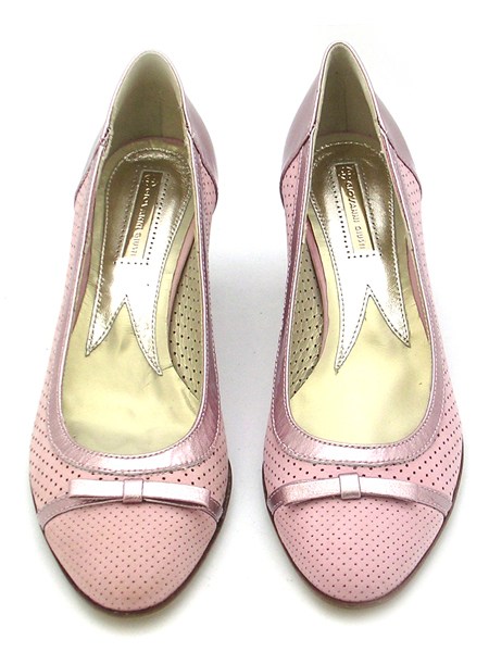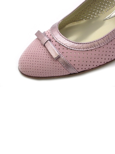 Туфли-лодочки светло розового цвета из натуральной кожи с перфорацией. Перфорированная кожа комбинирована с металлизированной кожей в тон. Подкладка изготовлена из телячьей кожи. Подошва из натуральной кожи, прорезиненная. Невысокий, устойчивый каблук 7 см.