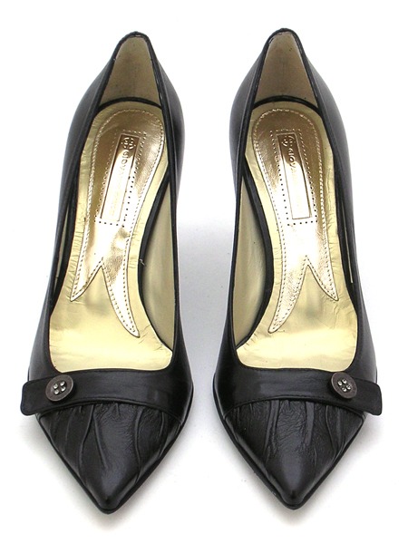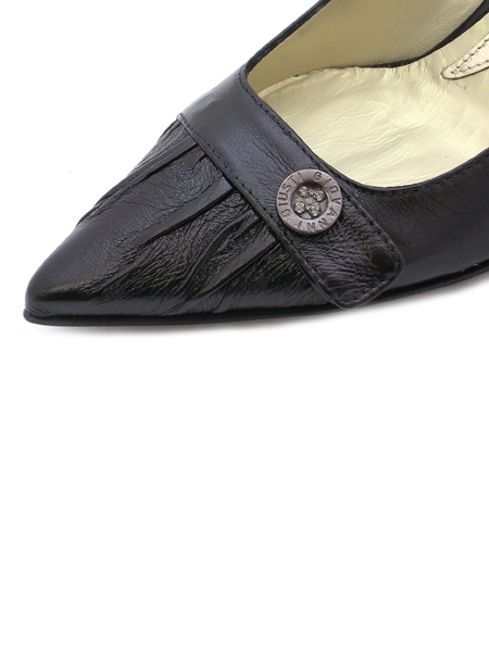Черные туфли из натуральной кожи, рельефно декорированы, никелевая пряжка. Подкладка из телячьей кожи. Подошва прорезиненная, из натуральной кожи. Каблук тонкий, 5 см.