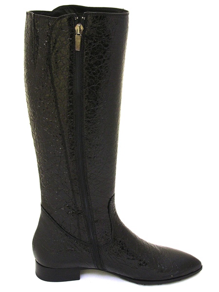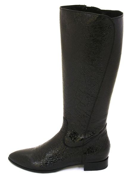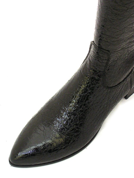 Высокие демисезонные сапоги из натурального жатого лака (наплак) черного цвета. Сапоги застегиваются на молнию. Подкладка изготовлена из натуральной кожи. Невысокий, широкий каблук 4 см. Подошва из натуральной кожи, с резиновым укреплением. Мысок чуть вытянут, острый. Колодка у этой модели очень удобная, подойдет под стопу любой полноты и любой подъем. Для большего удобства вверху голенища находится эластичная вставка.