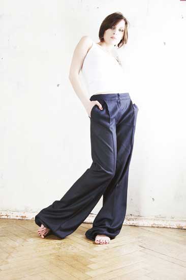 Стильные дизайнерские брюки классического покроя, широкие. Модель на бедрах, с карманами.