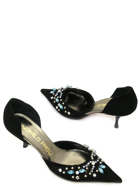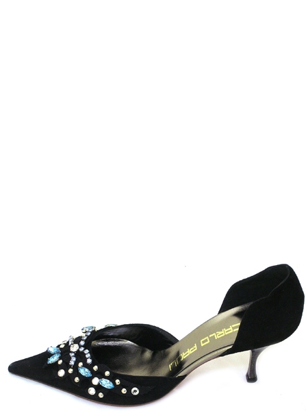 Нарядные классические туфли с острым мысом. Туфли из натуральной замши черного цвета, декорированные стразами Swarovsky. Подкладка изготовлена из телячьей кожи. Подошва-натуральная кожа с резиновым укреплением. Тонкий, высокий каблук высотой 9 см.