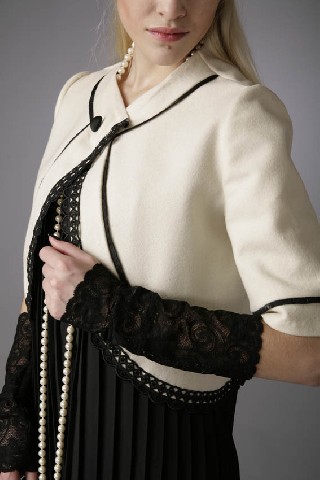 Рукава жакета короткие, застегивается на одну пуговицу, декорирован тесьмой.