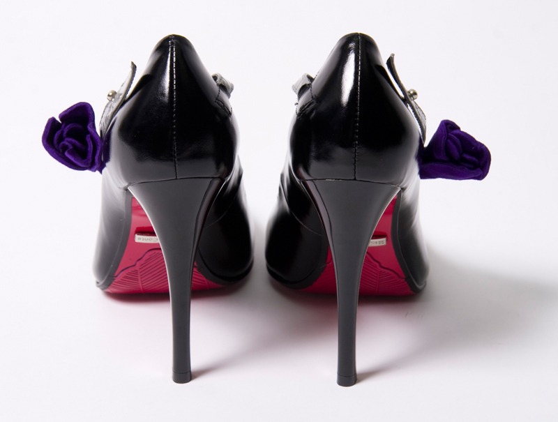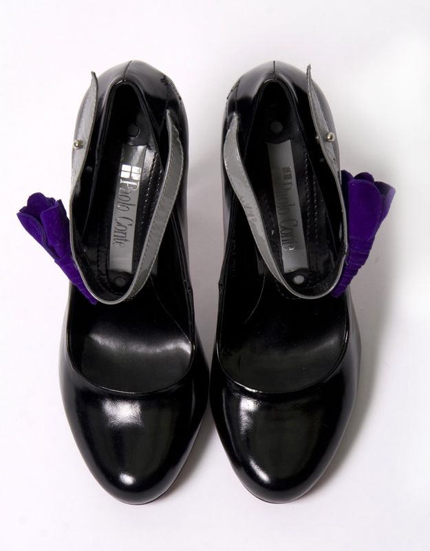 Изящные черные туфли на шпильке, с ремешком, декорированные лиловым цветком.