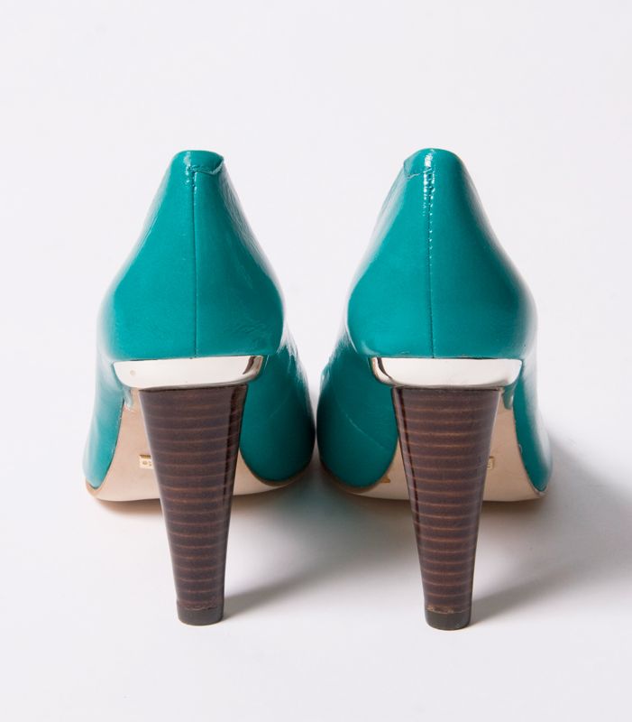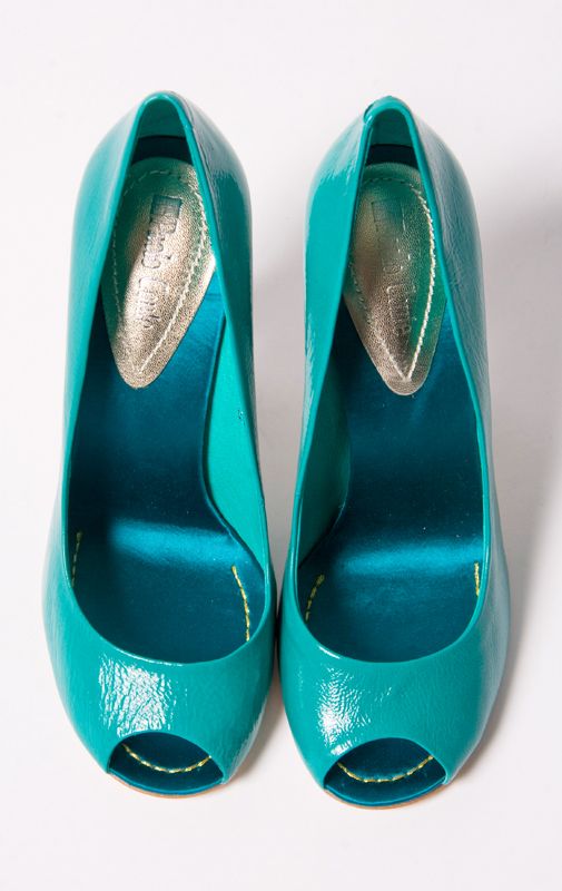 Туфли классической формы с открытым мысом выполнены из натуральной лаковой кожи великолепного голубого цвета.