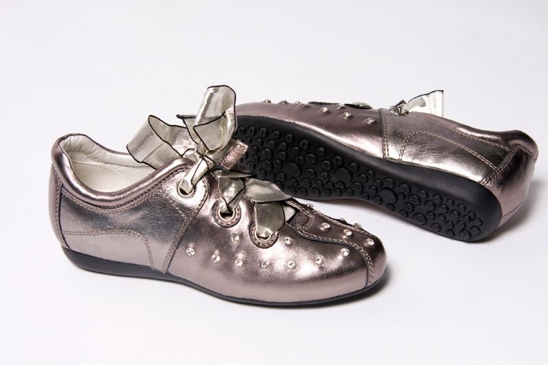 Стильные молодежные кроссовки из натуральной кожи серебристого цвета, декорированные крупными "стразами".