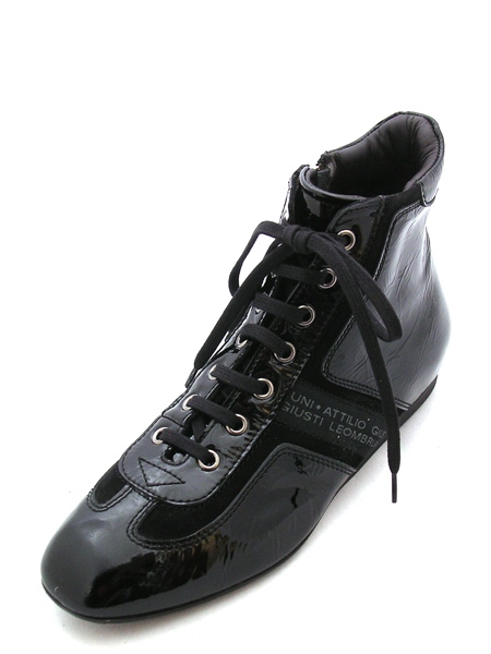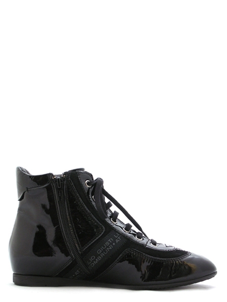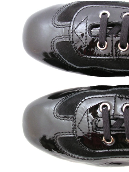 Женские кроссовки спортивного стиля из натуральной кожи (лак) черного цвета со вставками из черной замши и ленты с логотипом производителя.