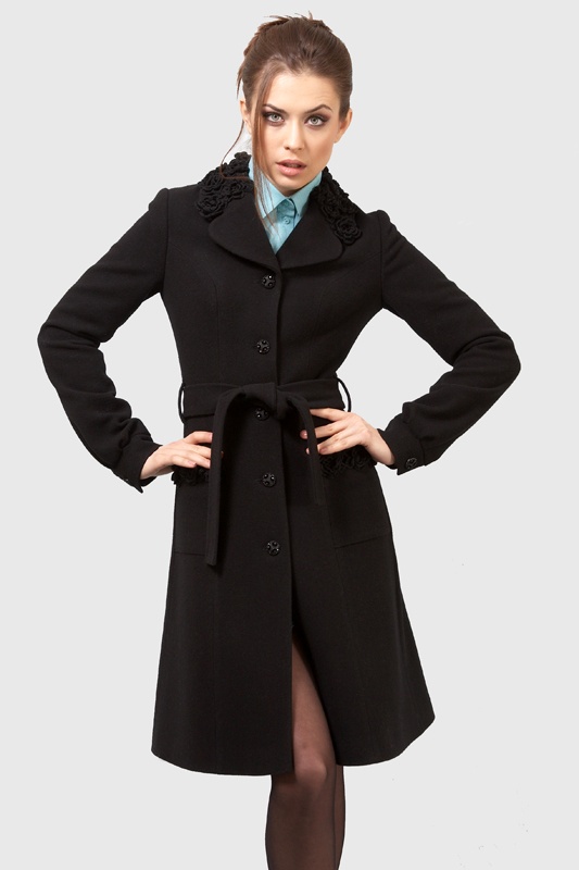 Пальто приталенного силуэта с поясом, воротник декорирован вязаным кружевом.
