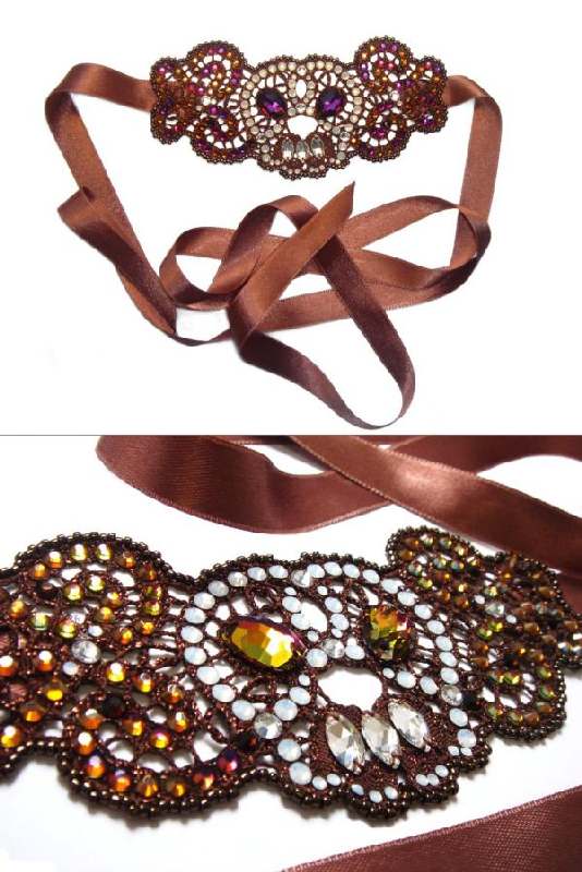Материалами за основу служит – полиэстер (Германия), соединяющая тонкая металлическая нить - металик мулинэ (Франция), бисер (Япония), стразы, кристалл Swarovski (Австрия).