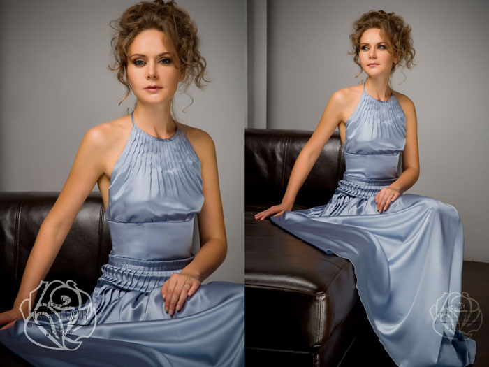 Великолепное выпускное платье, выполненное из натурального шелка серо-голубого цвета.