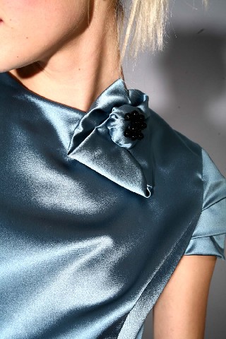 выпускное платье оригинального дизайнерского кроя с декоративными сборками, отрезное по талии, сзади каплевидный вырез, рукава - крылышки