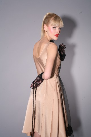 Платье прилегающево силуэта, юбка-полусолнце. Спереди платье украшено тонкой сеткой с кружевом.