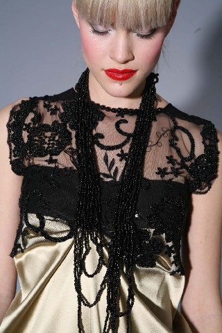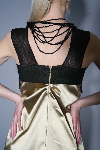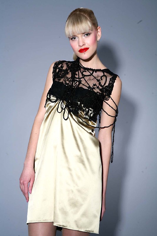 Платье с кокеткой из гипюра, вышитой бисером и необычной драпировкой. На спинке бретели. .