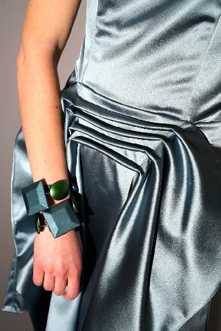 Платье оригинального дизайнерского кроя с декоративными сборками, отрезное по талии, сзади каплевидный вырез, рукава - крылышки