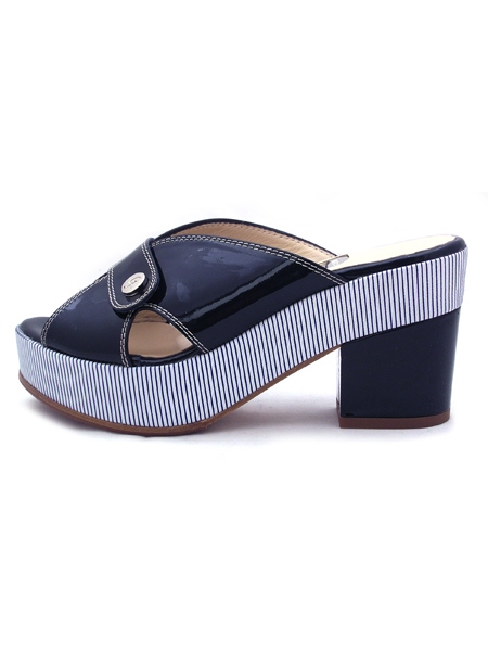 Оригинальные сабо выполнены в морском стиле - насыщенная темно-синяя лакированная кожа в сочетании с бело-синими полосками. Мысок украшен металлическими заклепками. Удобная колодка. Идеально подойдут для отпуска и выходных прогулок. Сочетается как с джинами, шортами, так и с юбками в спортивном стиле. В комплекте запасные набойки.