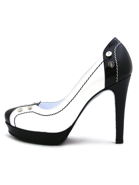 Эффектные и элегантные туфли на платформе и высокой шпильке из черно-белой мягкой кожи украшенные металлическими декоративными заклепками. Одинаково уместны на вечере, на любом светском выходе, на выпускном балу. В комплекте имеются запасные набойки.