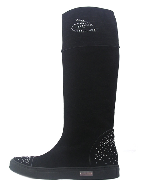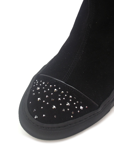 Сапоги из натуральной перфорированной замши классического черного цвета украшены на мыске и пятке стразами.