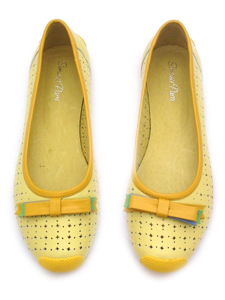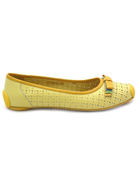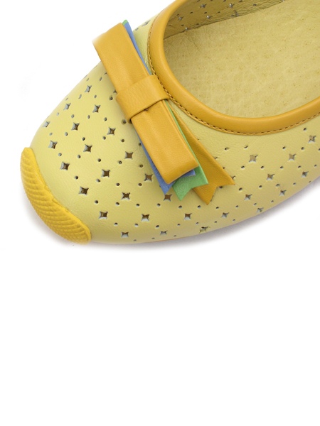 Модные летние балетки из натуральной перфорированной кожи солнечного желтого цвета, с цветным бантиком на мысе,