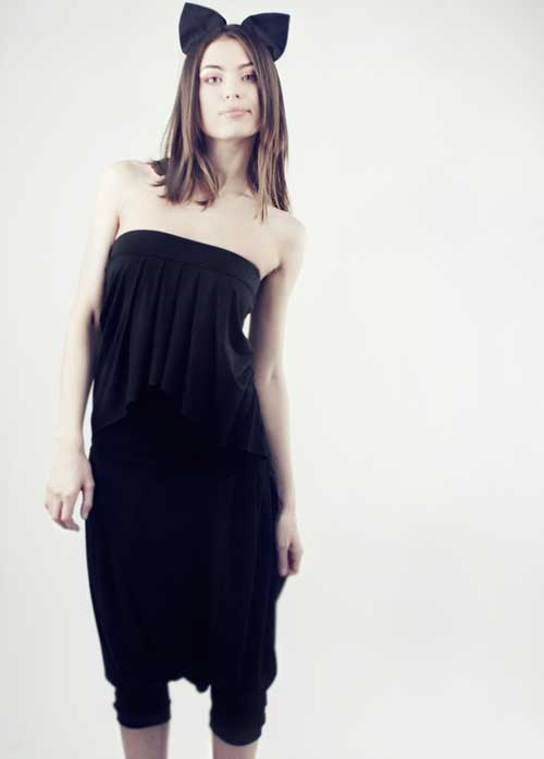 комбинезон из мягокого трикотажа, верх открыт (без бретелей), драпирован воланом. Брюки комбинезона с заниженной проймой.