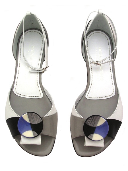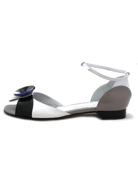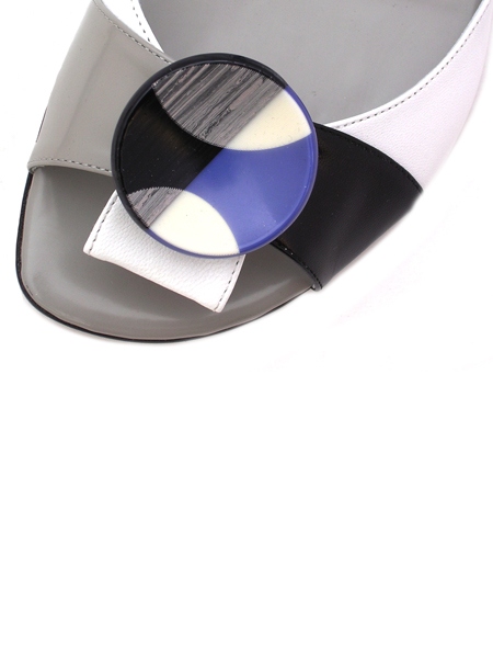 Женственные и милые босоножки на низком каблуке и с геометричностью форм. У босоножек изящный тонкий ремешок, обвивающий щиколотку. Оригинальная пряжка напоминает цветок. В общем исполнении босоножек наблюдается цветовой переход от белого к черному через кофейно-серый и спокойный лавандовый. Благодаря этому босоножки отлично подойдут под любой костюм.