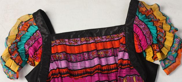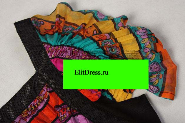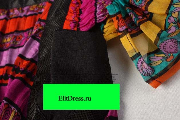 Покрой свободный, внизу мягкая, дышащая, не липнущая подкладка. Рукава присборенные, красиво ложатся и своей нежностью оригинально контрастируют с квадратным вырезом горловины, отделанной плотной шелковой тесьмой. Под рукавами, в начале бокового шва - трикотажная черная вставка, которая обеспечивает плотное прилегание платья с боков и позволяет его носить в жаркий день без бюстгальтера.