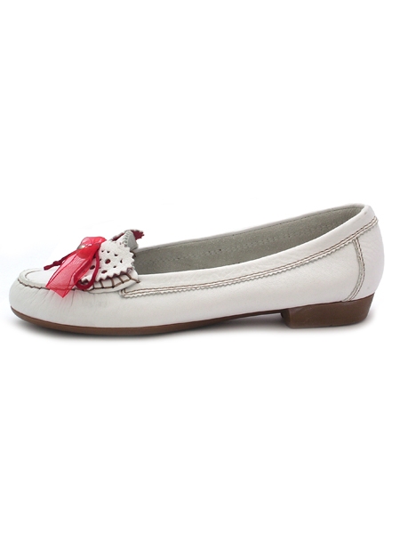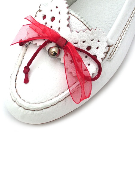 Классические мягкие и удобные мокасины молочного цвета с интересным алым бантиком из органзы. Колодка на стандартную полноту.