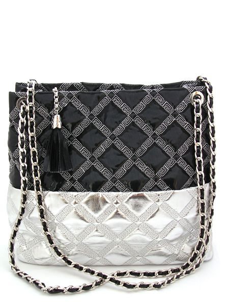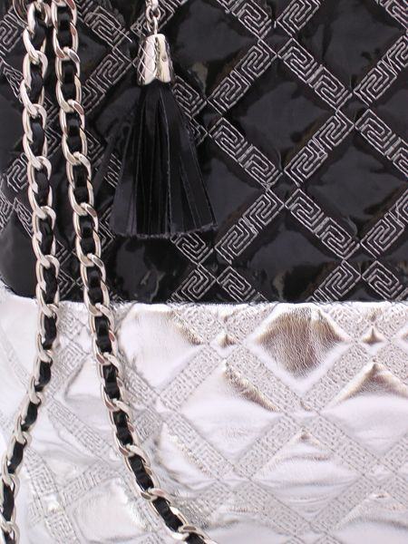 Материал верха: плотная простеганная набивная ткань типа плащевки в сочетании с черной и серебристой натуральной ламинированной кожей.